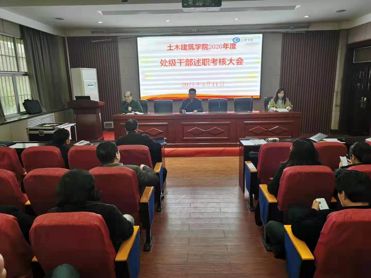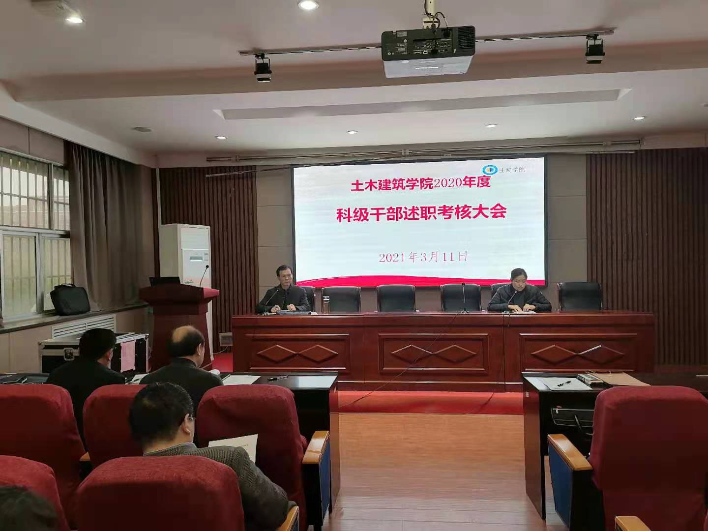 3月11日下午,公司在院结构实验室二楼学术报告厅召开2020年度领导干部述职考核大会。机关党委副书记马强,发展规划处校地合作科科长刘靖出席会议,学院班子成员和全体教师参加了会议。会议分两个阶段进行,第一阶段学院处级领导干部述职考核,党委书记李社教主持,第二阶段学院中层、教工党支部书记干部述职,副经理郭保来主持。