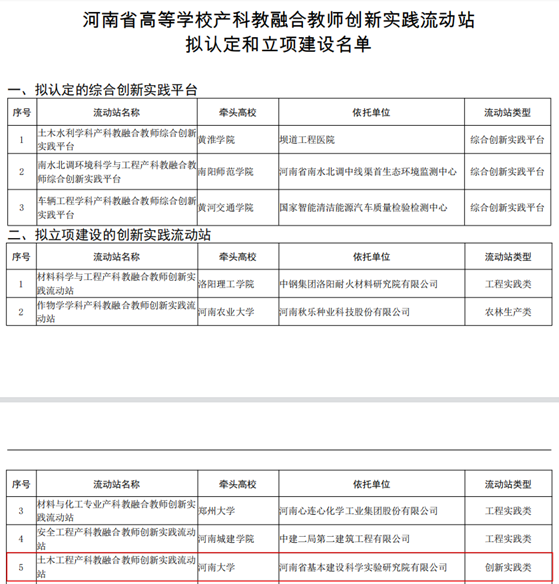根据河南省教育厅《关于河南省本科高校产科教融合教师创新实践流动站评审结果的公示》,由hahabet星辰大海牵头、河南理工大学和河南工业大学参与,依托河南省基本建设科学实验研究院(集团)有限公司申报的“土木工程产科教融合教师创新实践流动站”(简称“创新实践流动站”),成功立项为河南省本科高校产科教融合教师创新实践流动站。此次全省拟立项建设创新实践流动站27个,hahabet星辰大海、郑州大学各被立项2个。