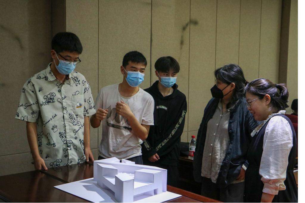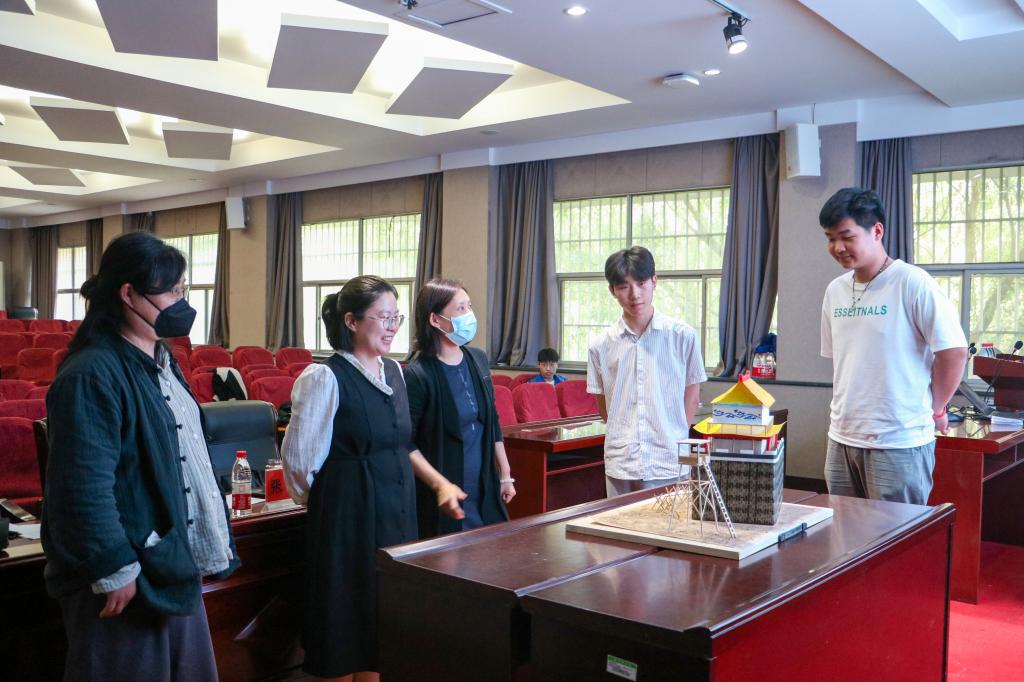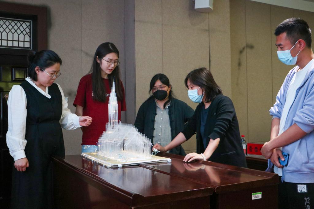 比赛分为两个环节,各组选手通过PPT从设计理念、作品细节、制作过程、结构特色、创意创新等方面进行展示,随后再由评委老师现场点评提问。现场不少作品让大家印象深刻。作品《永定楼》展现着该建筑设计秉持我国独特的古建筑风格,整体之雄浑而又不失精巧;作品《释迦塔》凸现该塔设计科学严密,构造完美、巧夺天工,是一座既有民族风格、民族特点,符合宗教要求的建筑,又是建筑结构与使用功能设计合理的典范;作品《伊斯兰艺术博物馆》重点介绍该建筑所运用的典型伊斯兰风格几何图案和阿拉伯传统拱形窗,为这座庞然大物增添几分柔和,中和了它的磅礴之气;作品《美国国家艺术馆》另具特色,注重对比和融合,该建筑外形采取古罗马式结构,分为东西两栋,一幢是充满现代风格的三角形建筑,一栋建筑为新古典式建筑,有着古希腊建筑风格。参赛同学展示的作品不仅体现了他们的专业素养,更展现了选手较强的动手实践能力以及创新精神、团队合作意识。