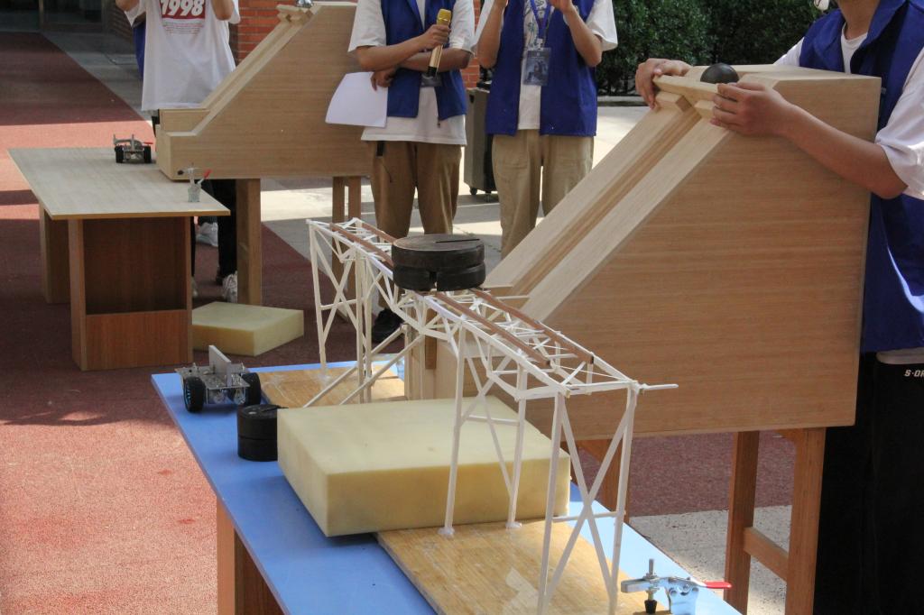 夏日炎炎,各参赛人员带着他们的参赛作品在学院楼前的圆形广场准备就位,各队伍按照抽取的顺序依次进行结构模型承载力测试及答辩,比赛开始首先进行模型结构测量,不满足参赛条件视为不合格。所有参赛作品统一进行称重记录。称重完成后,选手按照抽签次序上场,依照测试流程对模型进行一二三级逐级加载。加载过程扣人心弦,选手和观众们都屏气凝神,期待着模型能够加载成功。伴随着重物的承重、负重小车的通过、小钢球对模型的冲击,三轮加载正式结束,选手们悬着的心也缓缓落下。加载完毕后,评委老师根据各个环节的表现以及模型的结构打分,并针对模型的重量和结构做出评价,给出合理的优化方案。最终,第八组荣获一等奖;第一组、第五组荣获二等奖;第四组、第六组、第三组荣获三等奖。